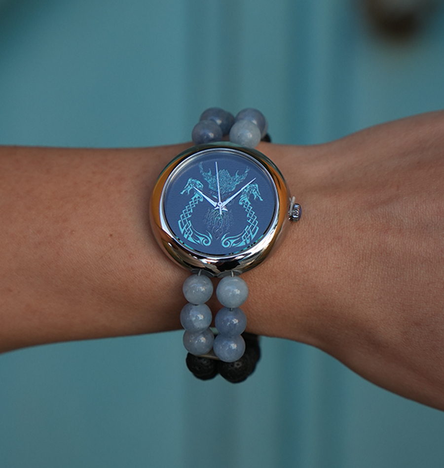 Saatin kadranında yer alan Viking sembolü, bu eserin kalbini oluşturur. Sembol, Vikinglerin savaşçı, kâşif ruhunu ve Nordik mitolojinin bilge yönünü temsil eder. Kenarlardaki Drekar olarak adlandırılan ejderha başları, Viking gemilerinin pruvalarını süslerdi. Bu başların, deniz yolculuklarında onlara koruma sağladığına inanılırdı.
