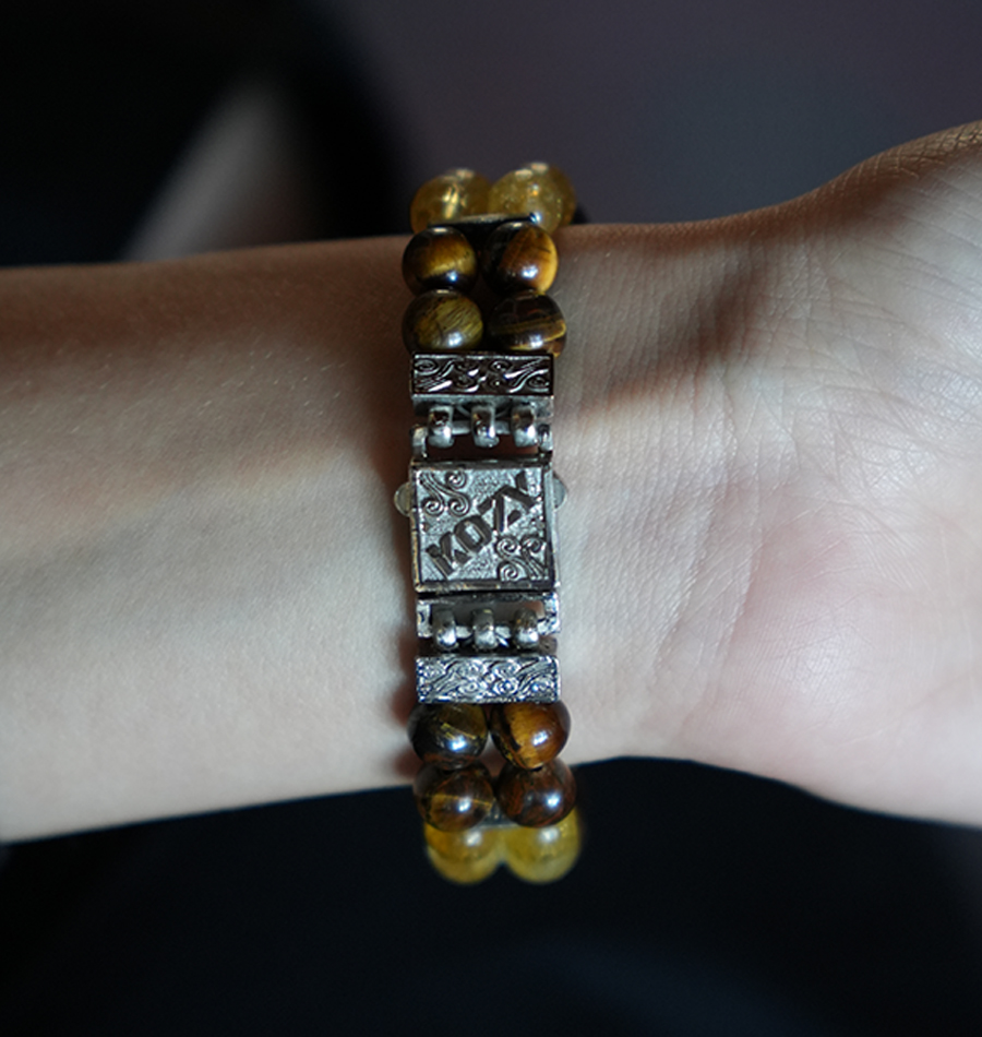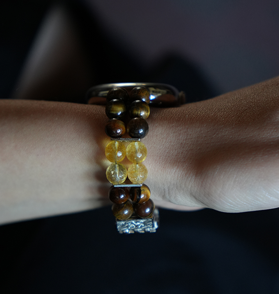 Kordonda kullandığımız diğer taş olan sitrin de yine güneş enerjisini taşıyan ve güneş çakrası ile bağlantılı bir taştır. Sitrin bu özellikleriyle kişide özgüven ve özsaygıyı güçlendirir. Güneş çakrası ile ilişkili olan bu iki taş birlikte kullanıldığında çok güçlü bir enerji ortaya çıkar. Ayrıca aralarındaki hoş renk geçişi, estetik bir bütünlük sunar. Kişisel güç, özgüven ve bollukla bağlantılı oldukları için taşıyana “Ben yapabilirim.” duygusunu verirler. Kaplan gözü korkuları dağıtırken, sitrin moral yükseltir; böylece zihinsel sis dağılır.
