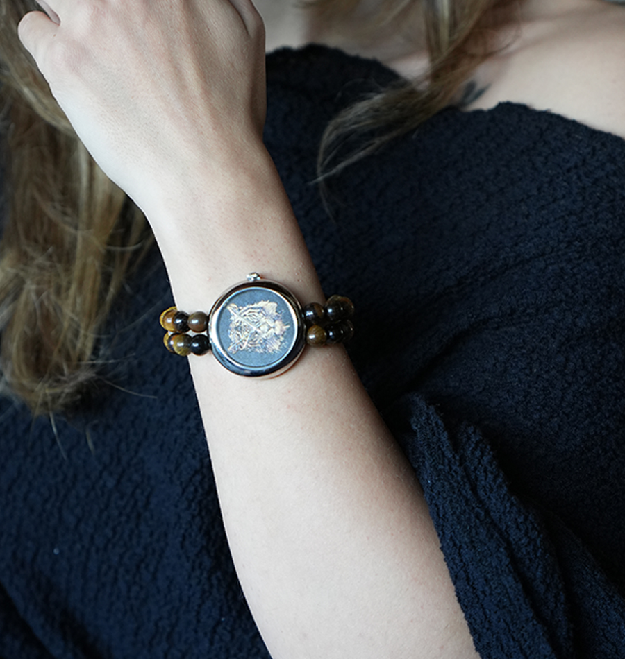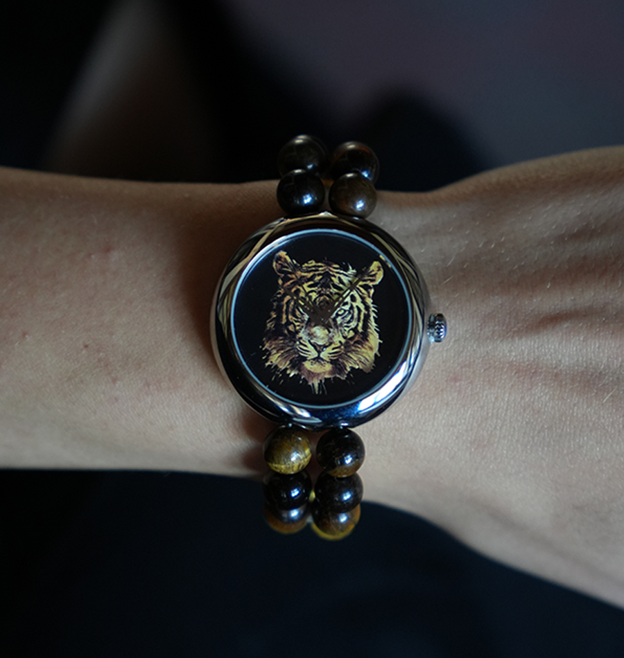 Kadrandaki kaplan figürü de bu konseptimizin hikâyesinin doğrudan temsilcisidir. Kaplan, her kültürde ve inanışta yalnız avlandığı ve yalnız gezdiği için cesaretin ve koruyuculuğun sembolü olmuştur. “Kaplan Cesareti” saatimiz ise hayatın tüm olumsuzluklarına ve negatif enerjilerine rağmen bunları geri yansıtan, taşıyıcısına özgüven ve cesaret gibi pozitif duygular sunarak daha kaliteli bir yaşam yolculuğunda ona eşlik edecek bir güç simgesidir.