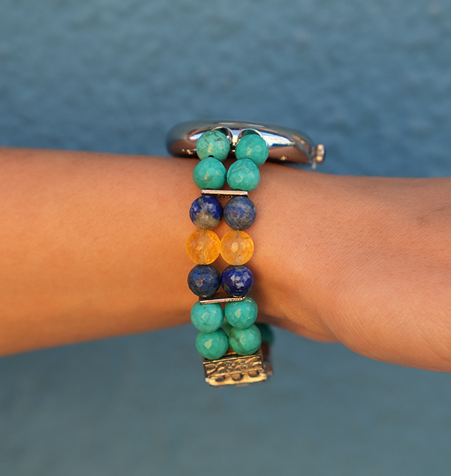 Bu konseptimizle turkuaz, lapis ve sitrini bir araya getirdik. Üç taş, üç farklı enerji ama tek bir amaç: insanı her türlü negatif enerjiden korumak ve iç huzuru güçlendirmek. Turkuaz taşı yüzyıllardır koruma taşı olarak bilinir. Mavinin en tatlı tonlarıyla gökyüzünün huzurunu taşır. İnsan ruhunu sakinleştirir. Lapis, bilgelik ve içsel farkındalığın sembolüdür. Zihni berraklaştırır ve doğru hissetmeyi kolaylaştırır. Sitrin ise güneş enerjisi taşır; neşe ve bolluk getirir. Bu üç farklı taş bir araya geldiğinde hem ruhu hem bedeni dengeleyen güçlü bir uyum doğar.