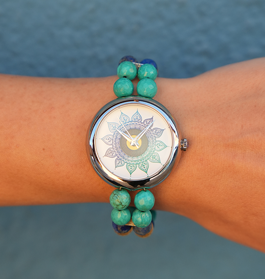 Bilekliğin ortasında duran nazar boncuğu sembolü, tüm bu enerjilerin ortasında bir koruyucu göz gibidir. Mandala deseni, nazar boncuğuna ayrı bir estetikle hava katar. Her bir taş, nazar boncuğu sembolü ile birlikte bir anlam bütünü oluşturur: huzur, mutluluk, bilgelik ve koruma. Tatlı renk geçişleriyle de hoş bir görüntü sunan nazar konseptimiz, sadece bir saat değil, insanın kendini kötü enerjiden, karamsar düşünceden ve her türlü negatif bakış ve niyetlerden koruyan zarif bir aksesuardır. Bazen en güçlü koruma, inançla takılan bir sembolde gizlidir.