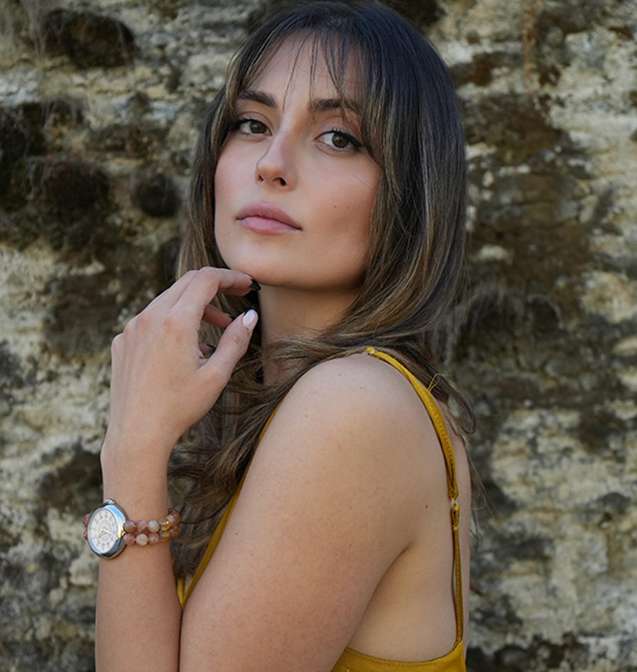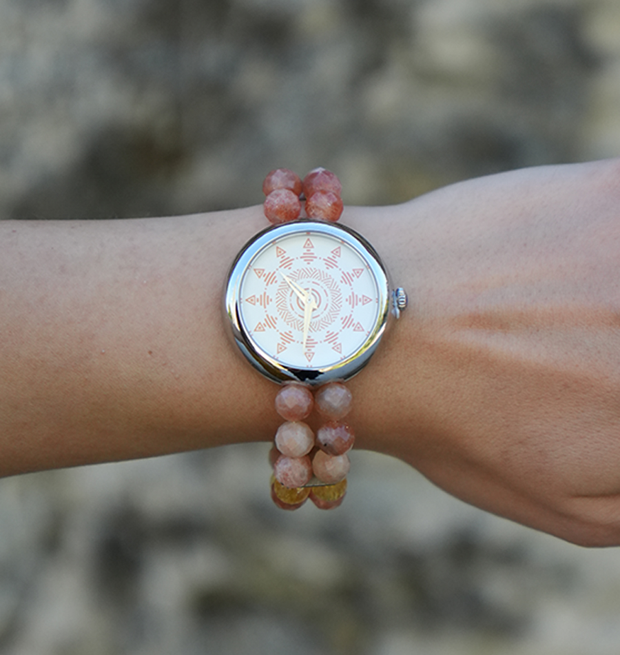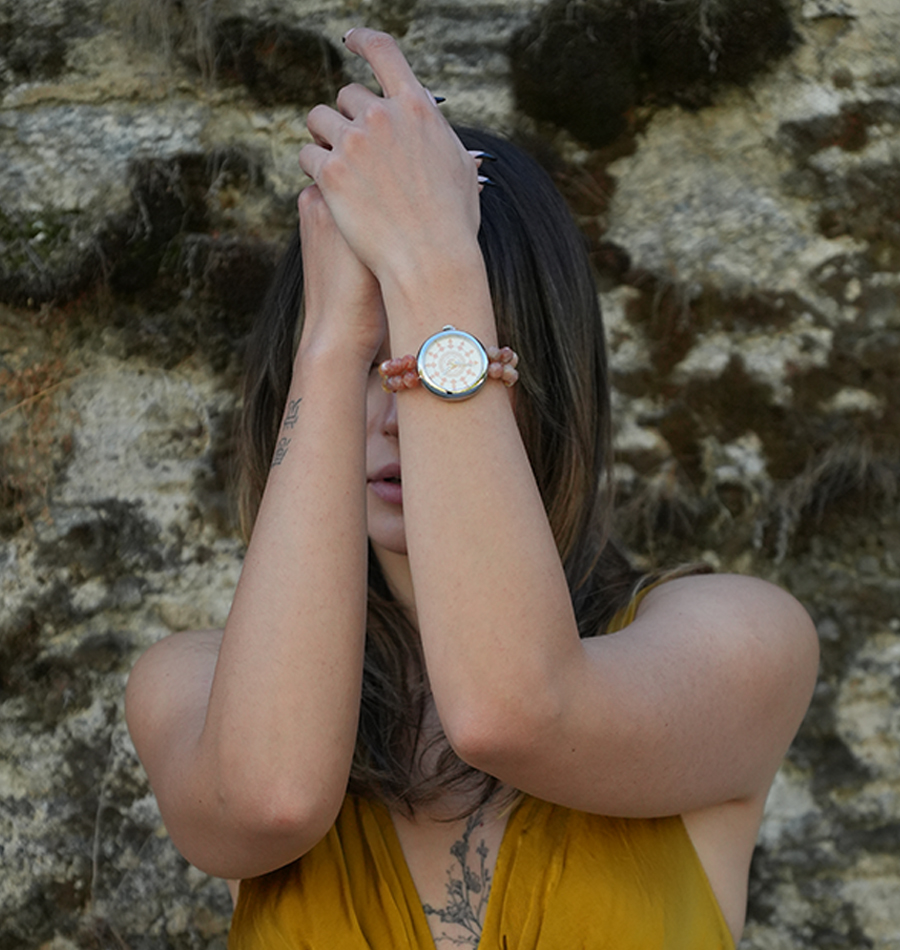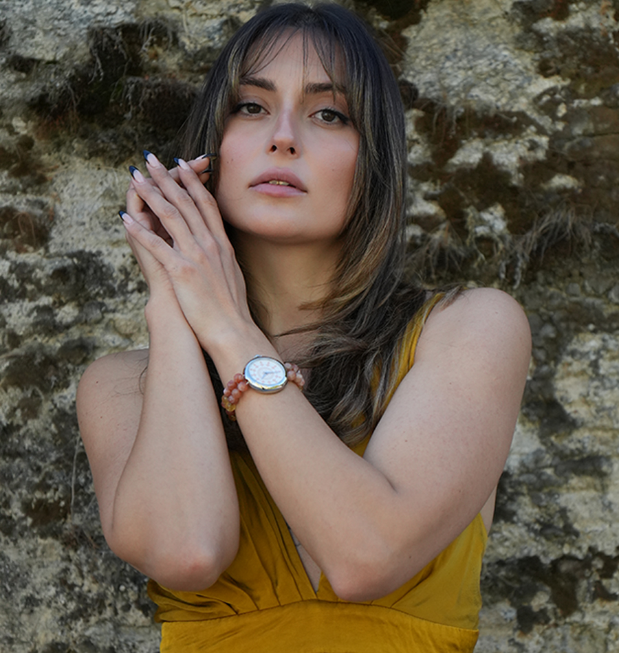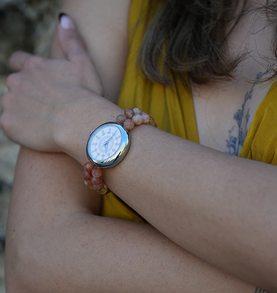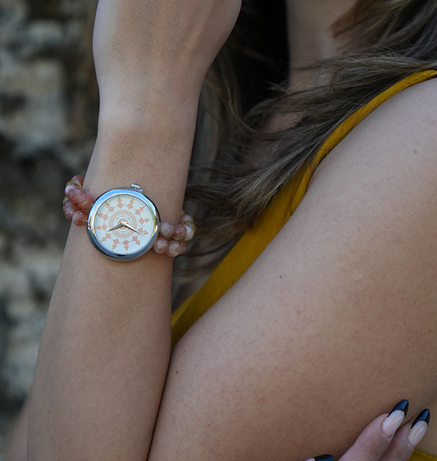 Bu iki taşın bir araya gelmesiyle oluşturduğumuz konsept, her geçen saniye içsel ışığınızla birleşerek karşınıza çıkan fırsatların potansiyelini açığa çıkarır. Saatin kadranındaki geometrik güneş deseni ile kordondaki doğal taşlar birleştiğinde, taşıyıcısına şu mesajı verir: